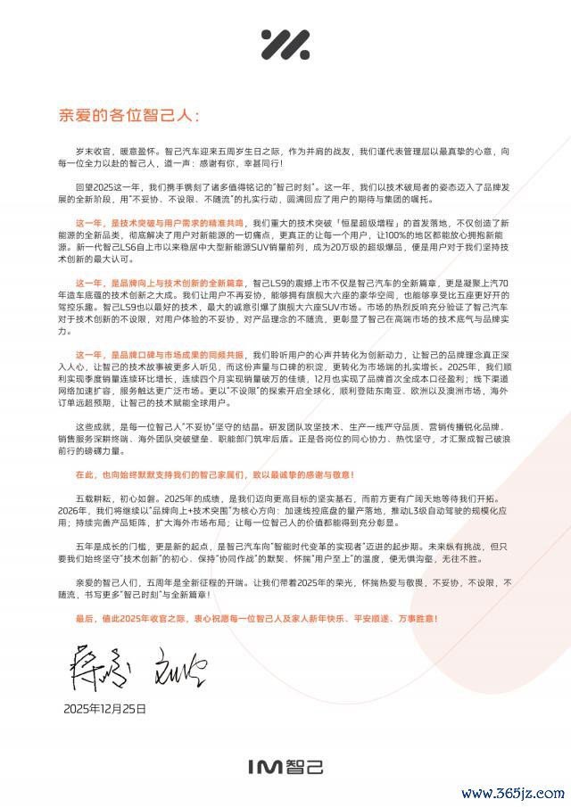 IT 之家 12 月 25 日音信,智己汽车当天迎来确立五周年,官方发布了致举座职工的里面信,借此总结 2025 年的发展效果与 2026 年的策画。
